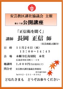 安芸教区講社協議会主催 第27回 公開講座 日 時 2025(令和7)年11月26日(水) 13:00~14:45 講 師 長岡 正信 師(安芸南組正圓寺) 講 題 「正信偈を聞く」 聴講料 1,000円 会 場 本願寺広島別院 本堂 備 考 事前の申込は必要ございません。聴講料は当日お支払いください。 問合せ TEL 082-231-0302(担当:藤井)